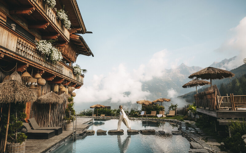Rusikaler Charm kombiniert mit stilvollem Ambiente – das ist das Jufenalm BOHO Hotel & Restaurant in der Nähe von Maria Alm mit beeindruckendem Blick auf die umliegenden Berge.